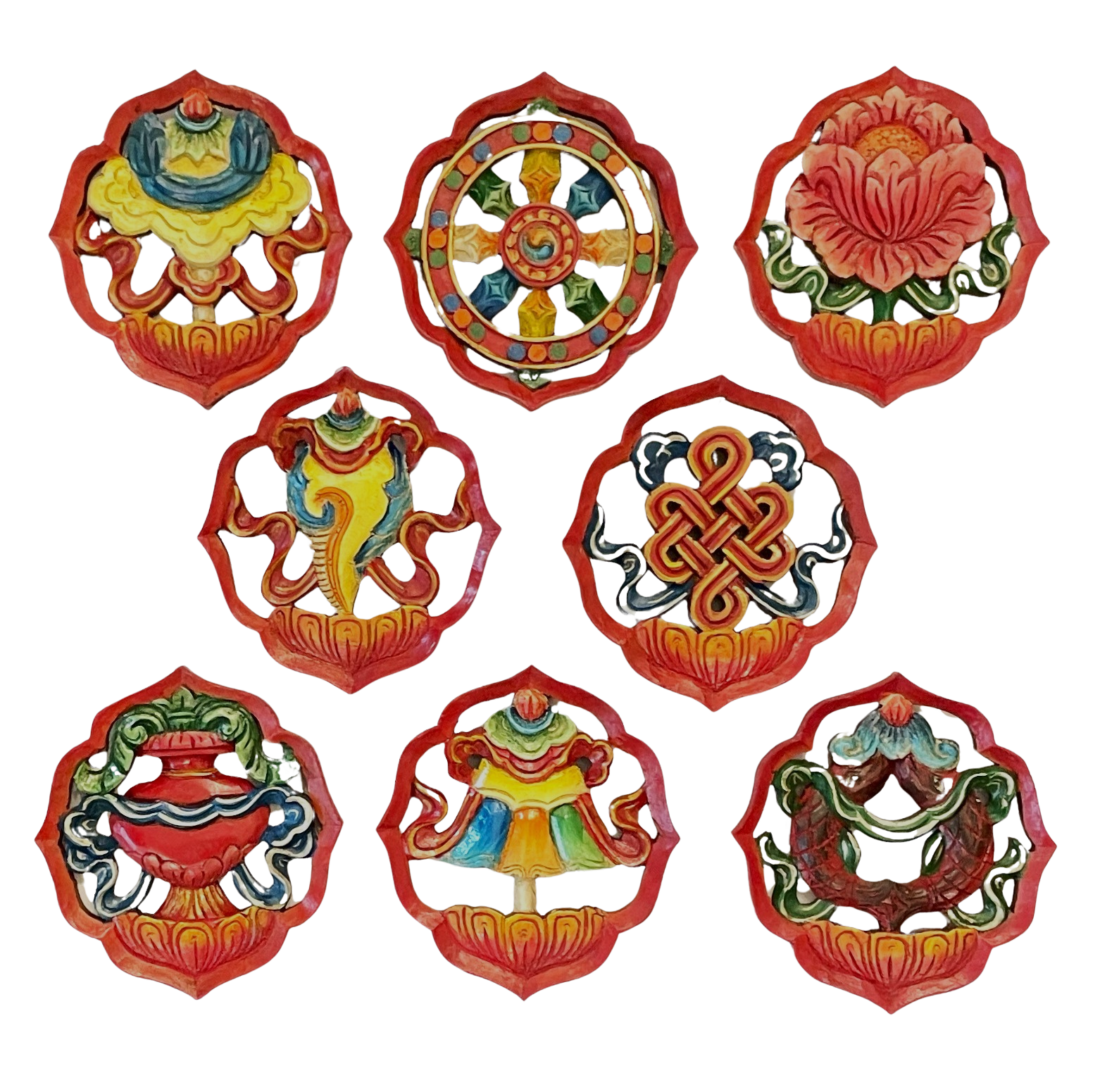 Mandala med Ashtamangala skåret i træ og malet. De 8 lykkebringende tibetanske tegn.