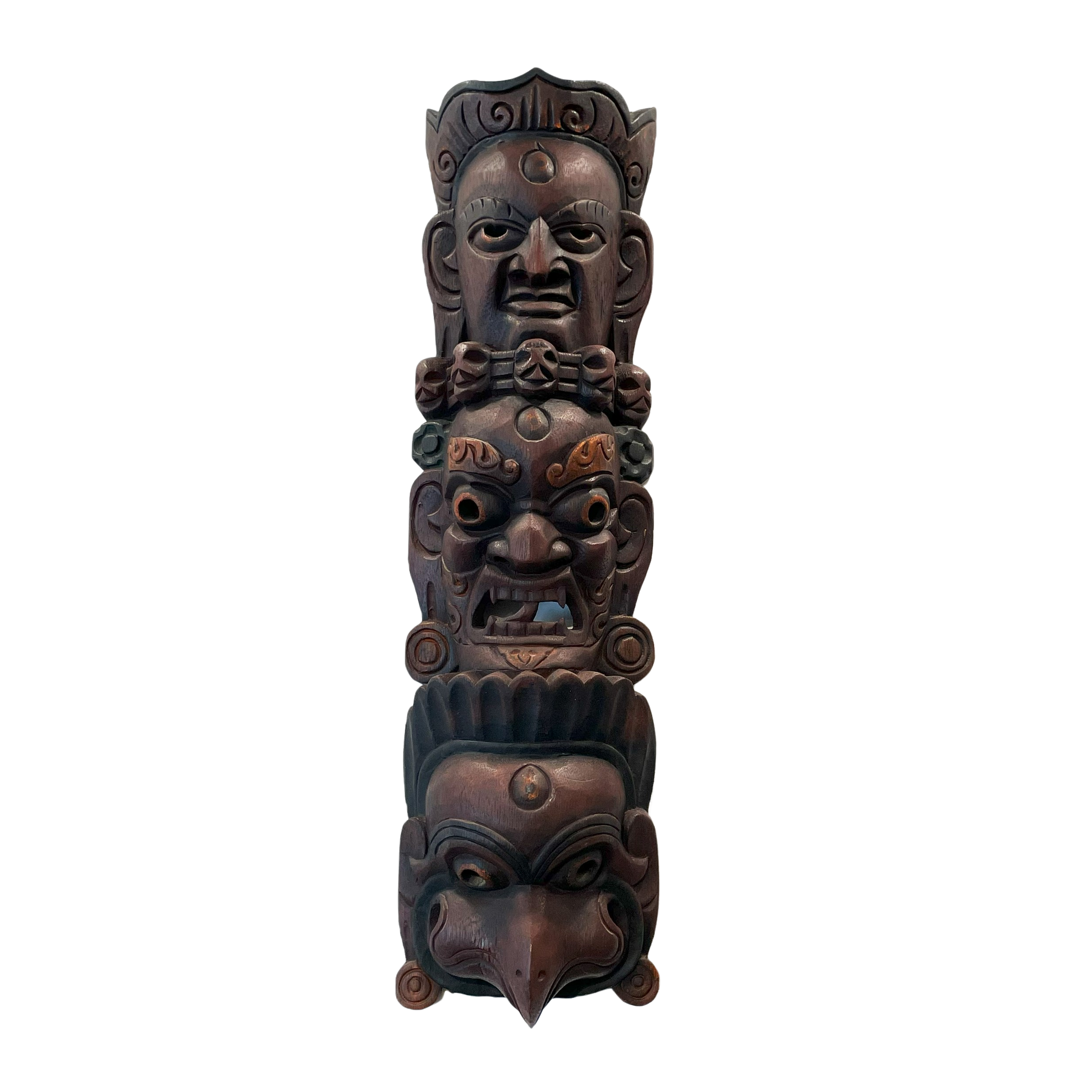 Gammel Mahakala maske med Garuda og en Lama udskåret i træ og malet. Mahakala er en beskytter, især for Kamapa’er, og skal hænges over indgangsdøren.