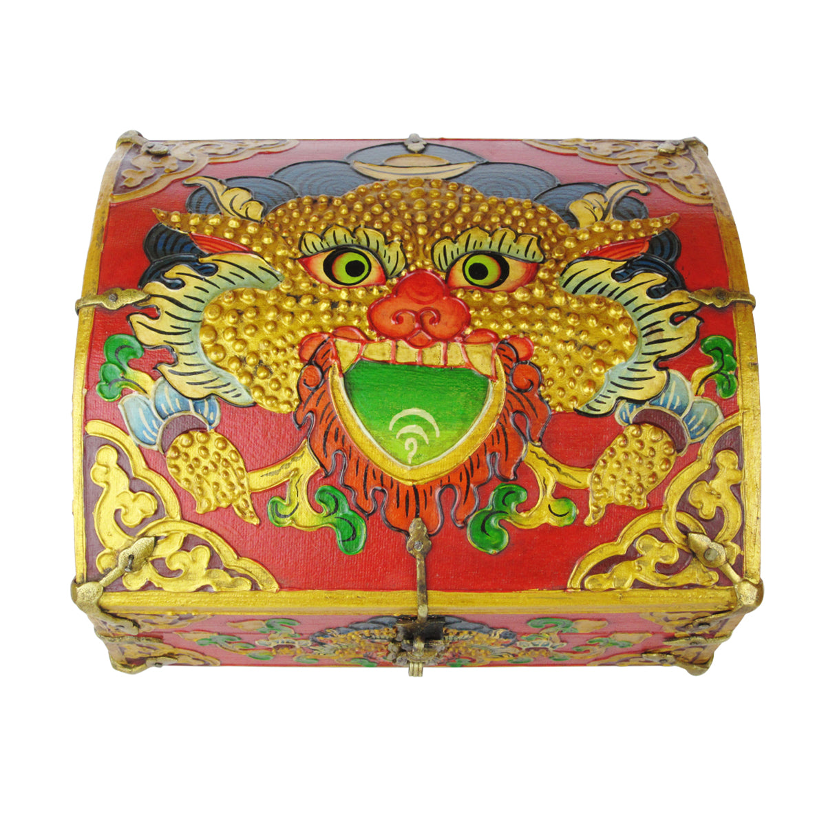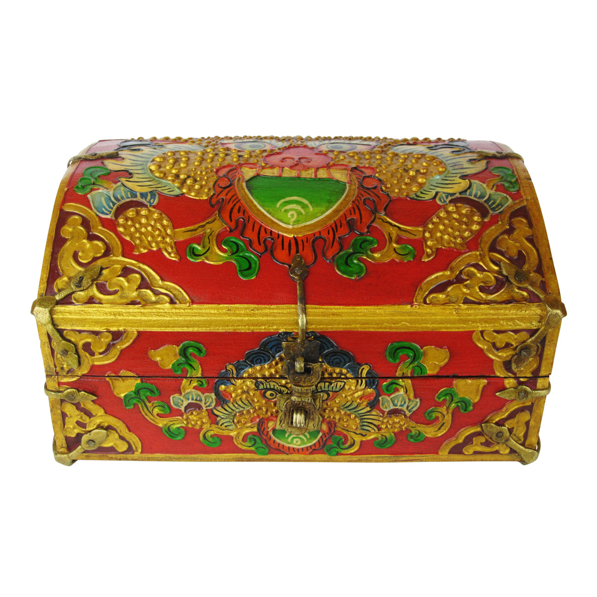 Smuk Kiste malet på 3 sider og låg med Cheepu og andre Tibetanske Buddhistiske motiver, med messingbeslag på hjørnerne og siderne, i antik finish.