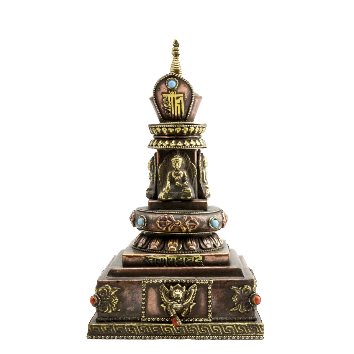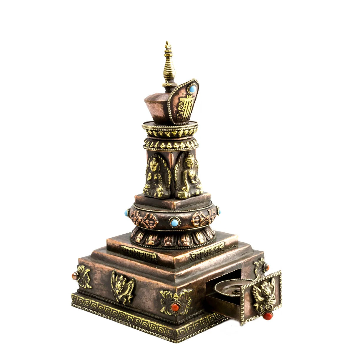 Stupa røgelses brænder i kobber og messing, sat med koraler og turkiser. Udsmykket med 4 Dhyani Buddha’er, Vajras og Garuda’er, med en lille skuffe, der kan trækkes ud, med huller til røgelse.