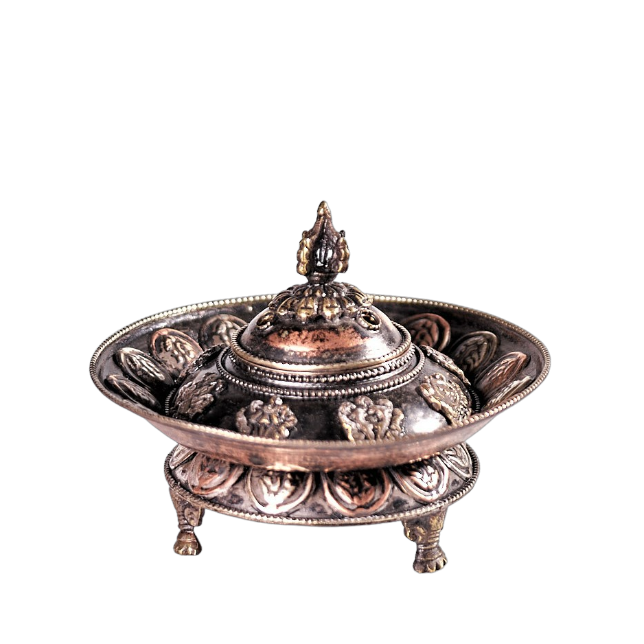 Håndlavet røgelsesbrænder i kobber og messing med Ashtamangala ( de 8 lykkebringende Tibetanske tegn ) og en halv Dorje.