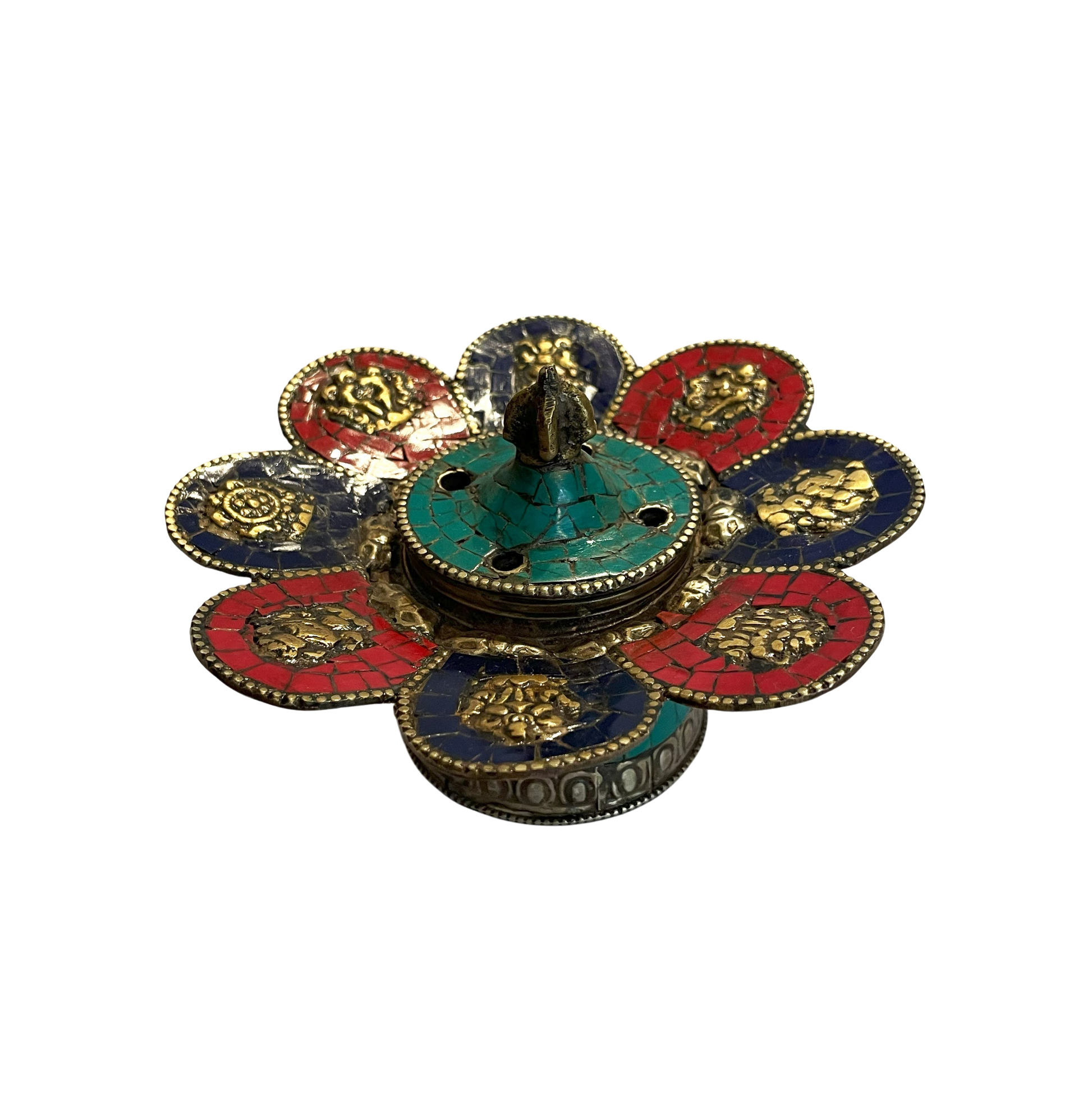 Håndlavet røgelsesbrænder i kobber og messing sat med Turkiser, Koraler og Lapis Lazuli. Ligeså med Ashtamangala ( de 8 lykkebringende Tibetanske tegn ) og en halv Dorje.