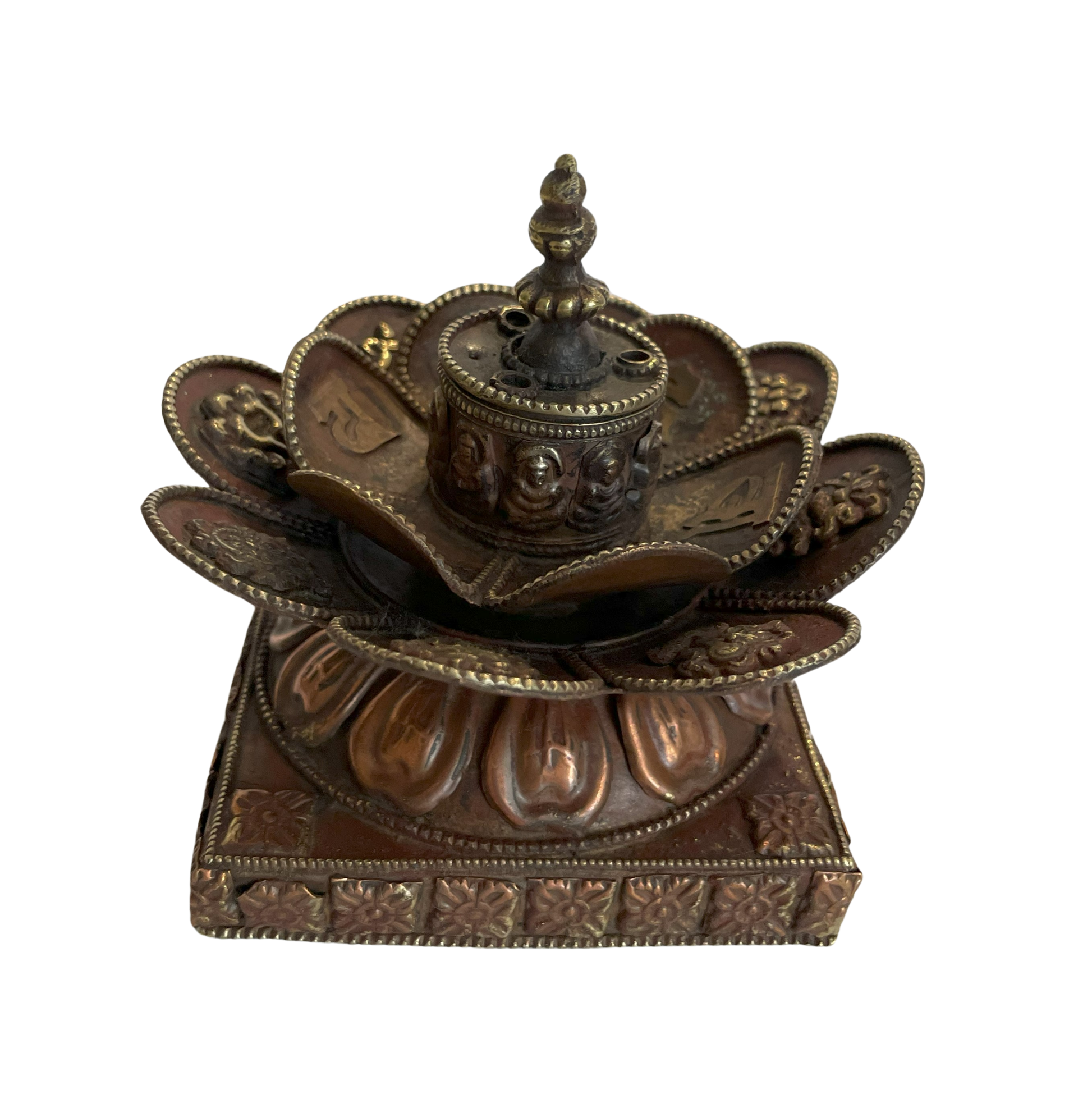 Håndlavet røgelsesbrænder i kobber og messing med Ashtamangala ( de 8 lykkebringende Tibetanske tegn ) og Chenrezi mantra "Om Mani Padme Hum" samt en stupa.