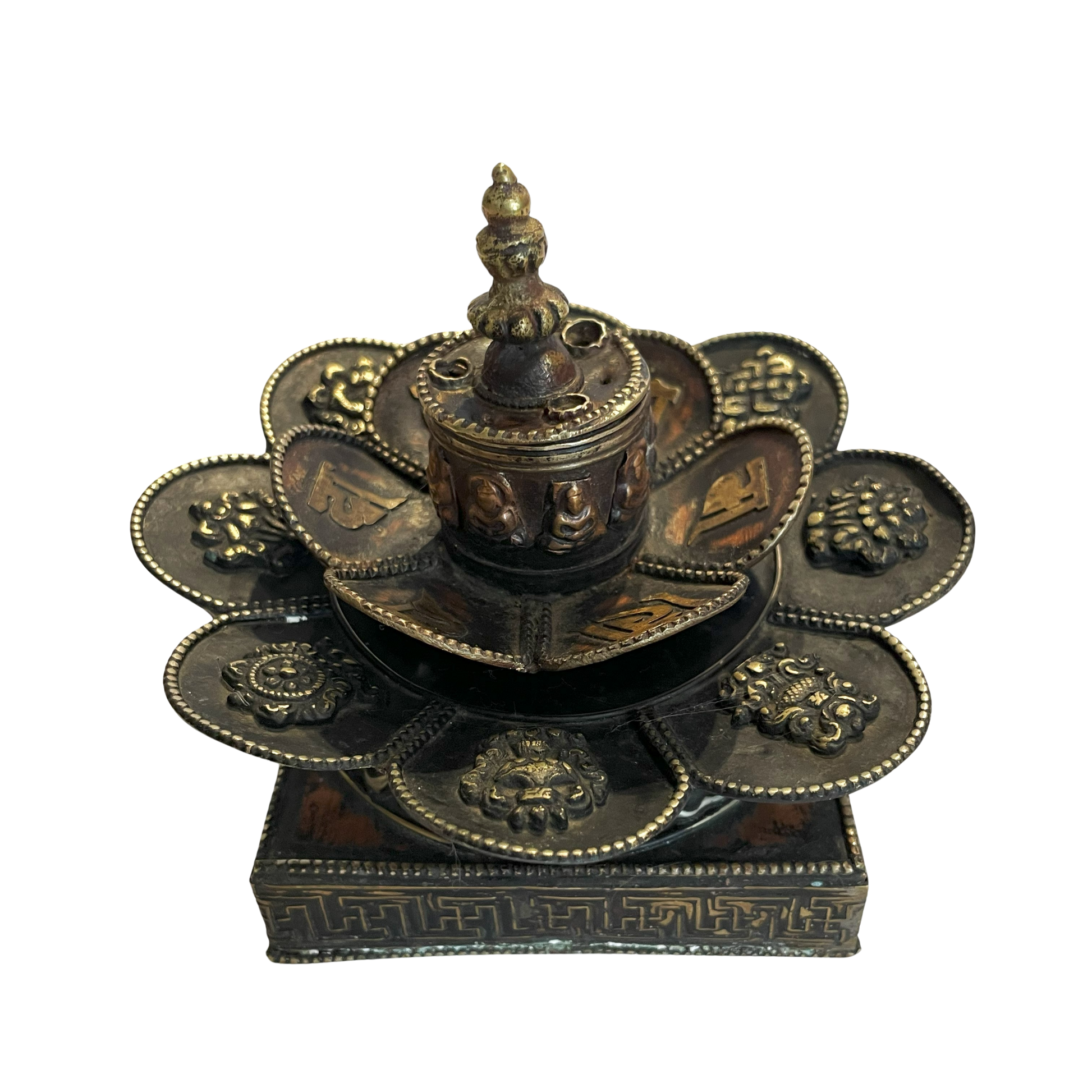 Håndlavet røgelsesbrænder i kobber og messing med Ashtamangala ( de 8 lykkebringende Tibetanske tegn ) og Chenrezi mantra "Om Mani Padme Hum" samt en stupa.
