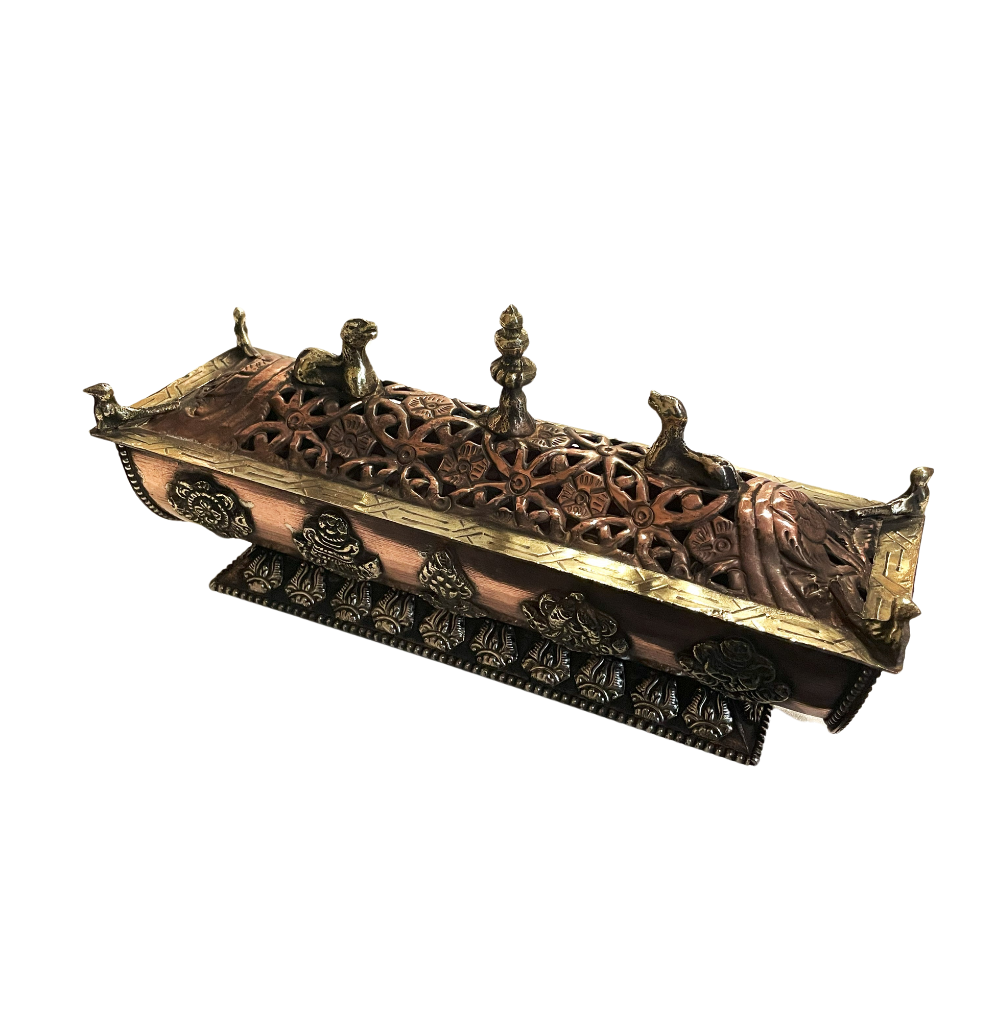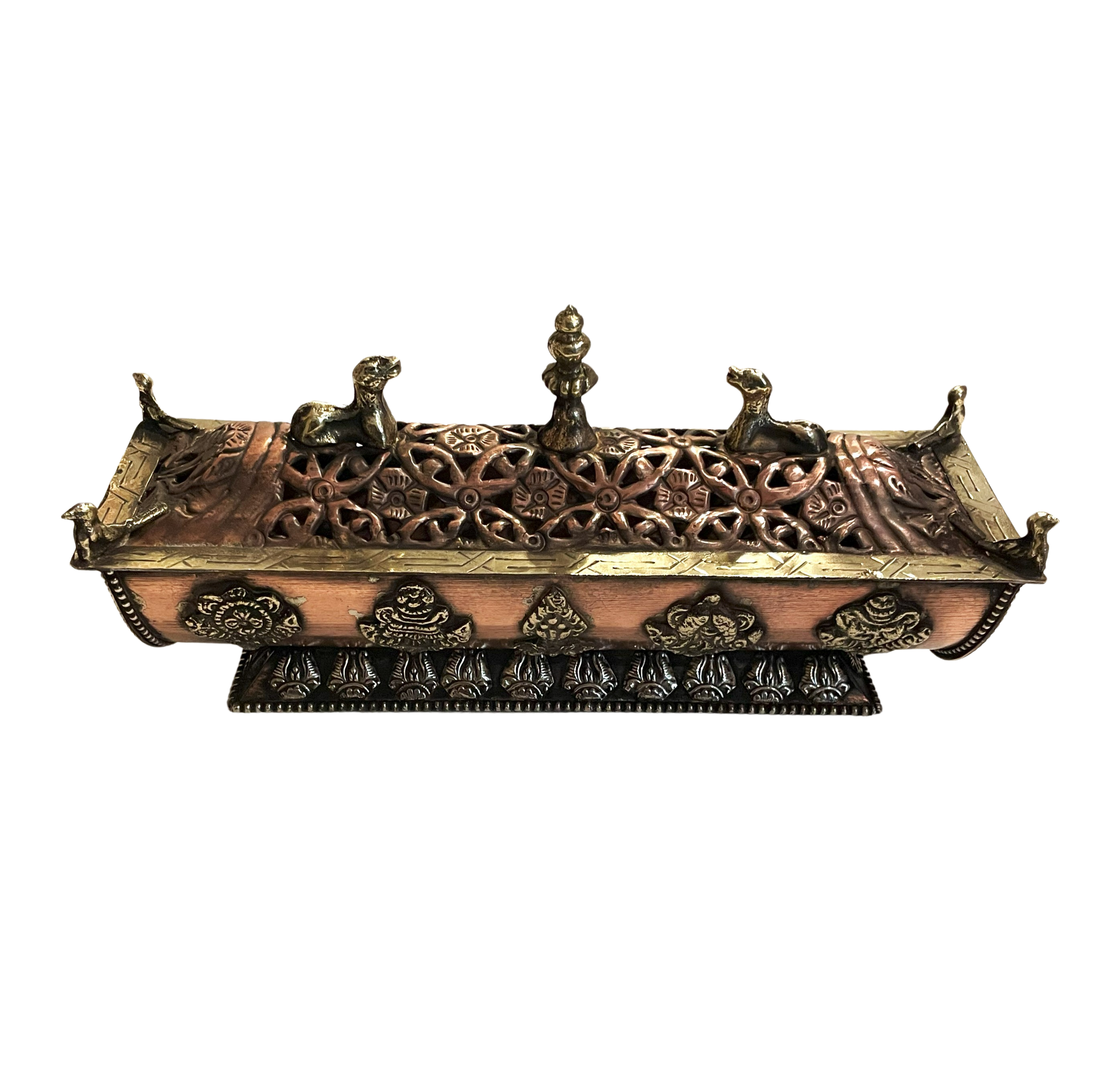 Håndlavet røgelses brænder i kobber og messing med Cheepu, Ashtamangala ( de 8 lykkebringende Tibetanske tegn ) og andre Buddhistiske symboler.