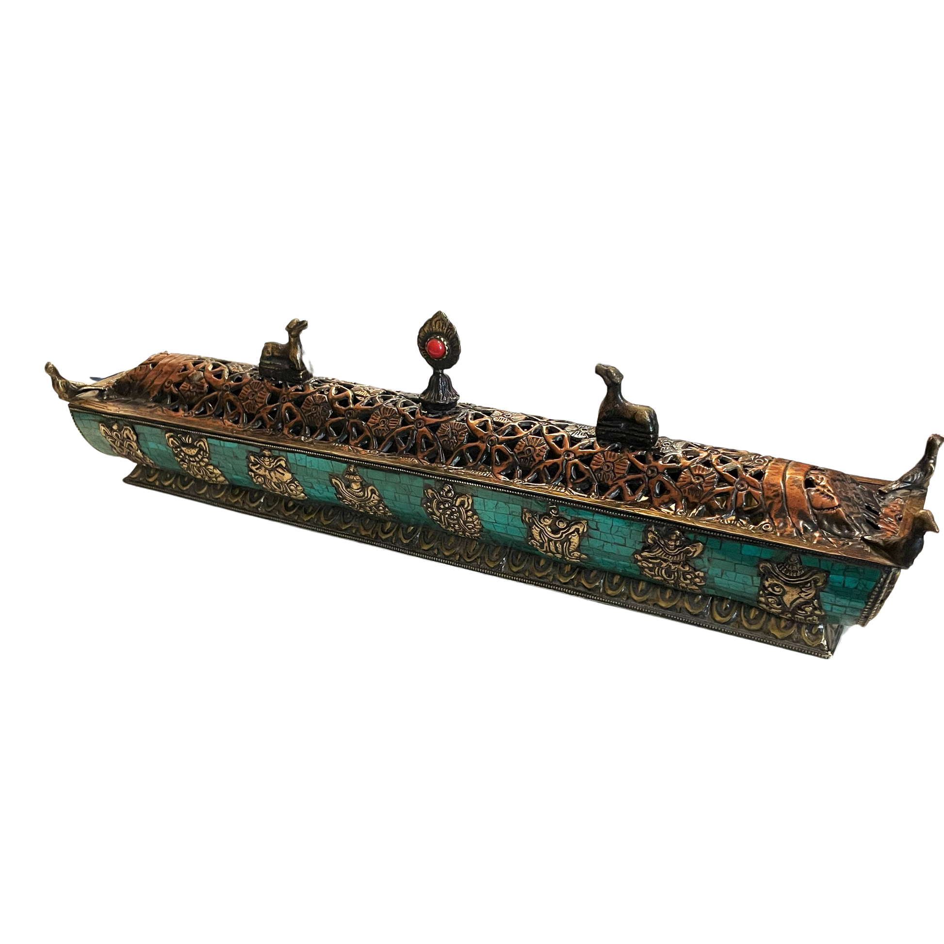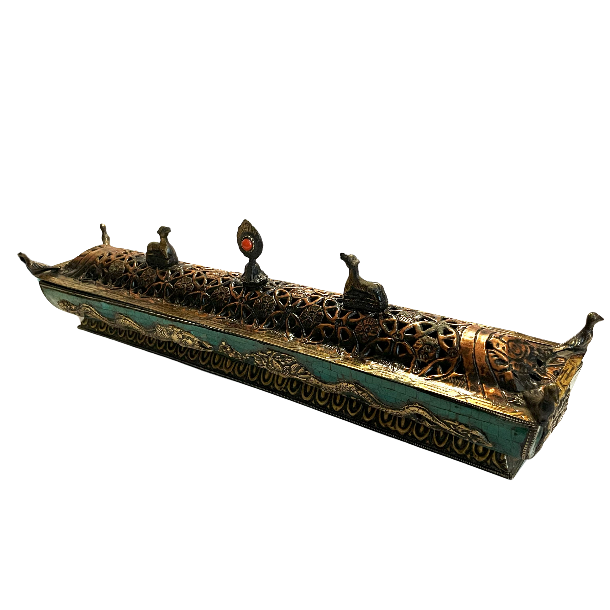 Sjælden håndlavet røgelses brænder i kobber og messing, indlagt med Turkis. Cheepu, Ashtamangala ( de 8 lykkebringende Tibetanske tegn ), Drager og andre Buddhistiske symboler.