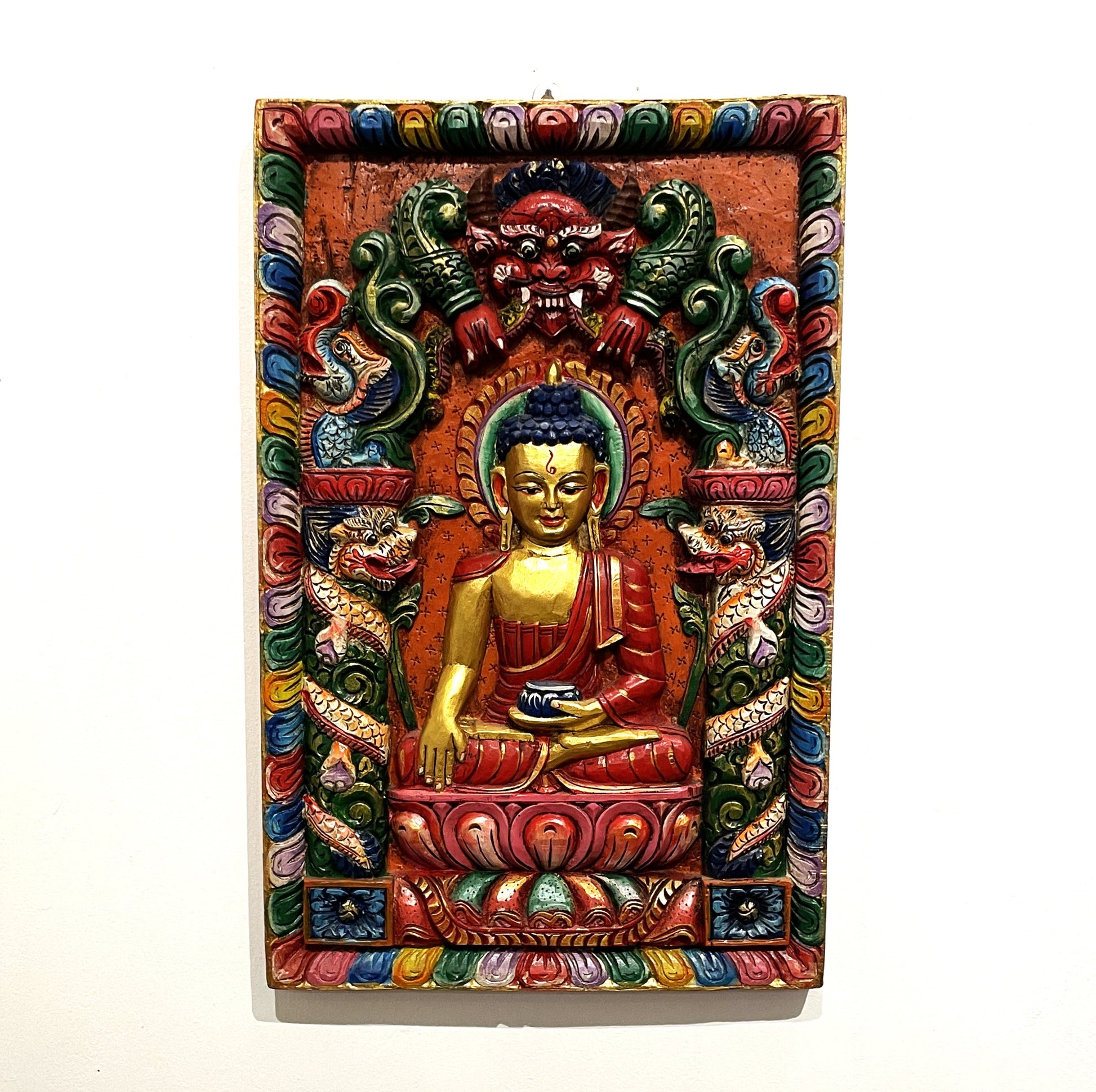 Shakyamuni Buddha skåret i træ og malet med drager og Garuda samt buddhistiske symboler.
