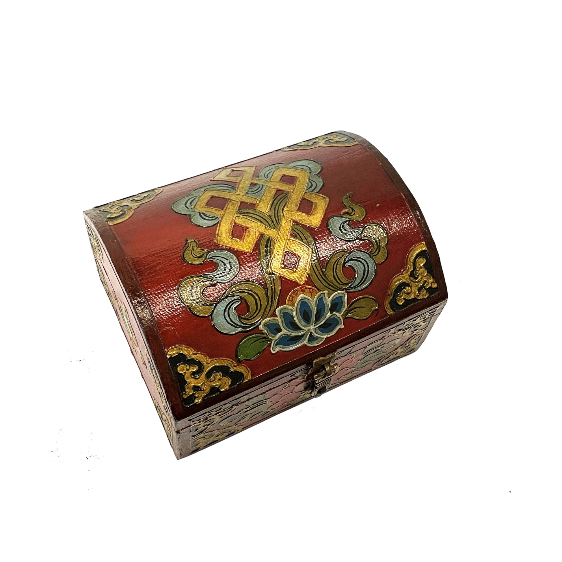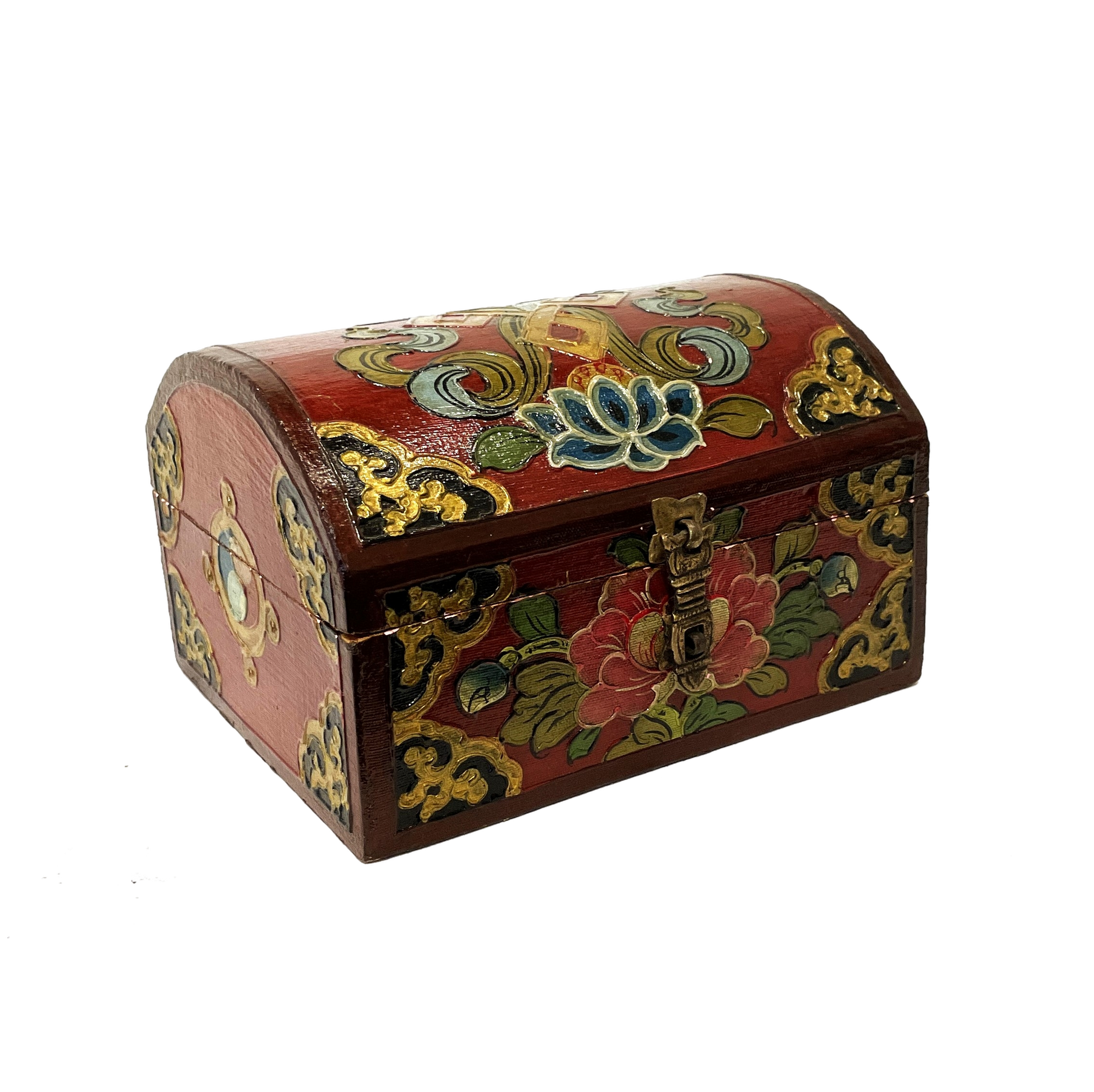 Smukt skrin i træ, malet med Lotusblomster og andre Tibetanske Buddhistiske motiver, i antik finish.