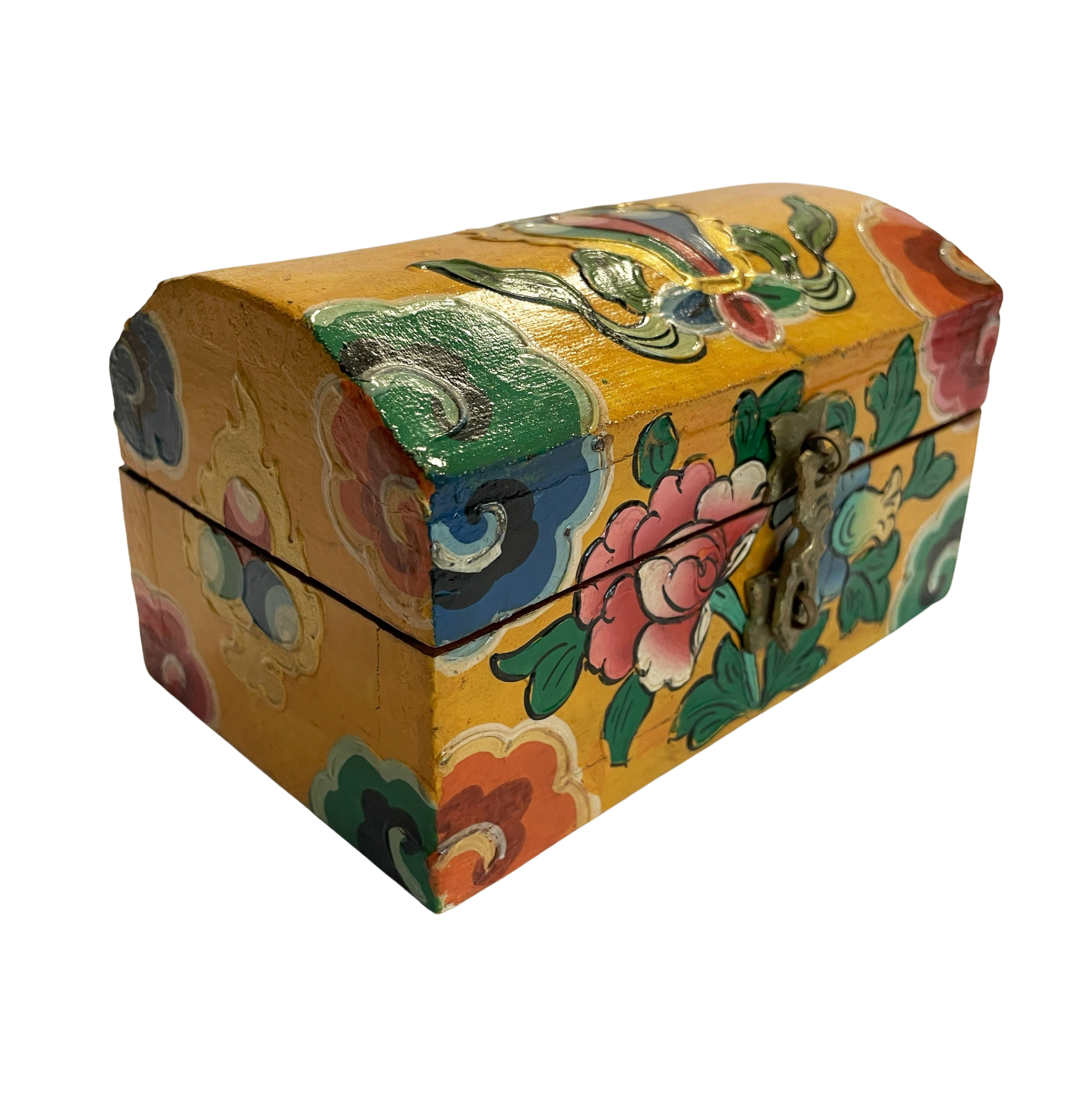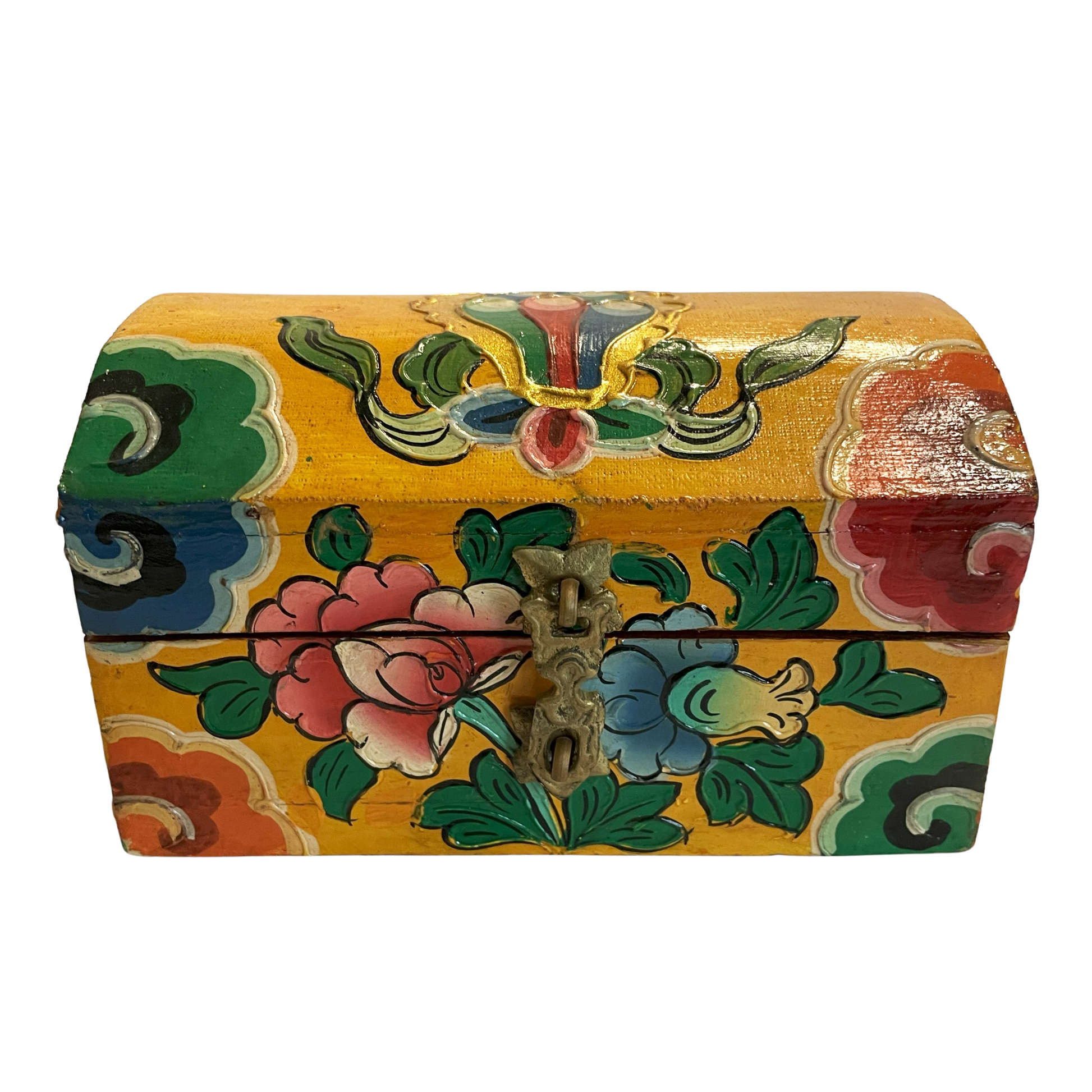 Smuk kiste i træ, malet med Lotusblomster og andre Tibetanske Buddhistiske motiver, i antik finish.