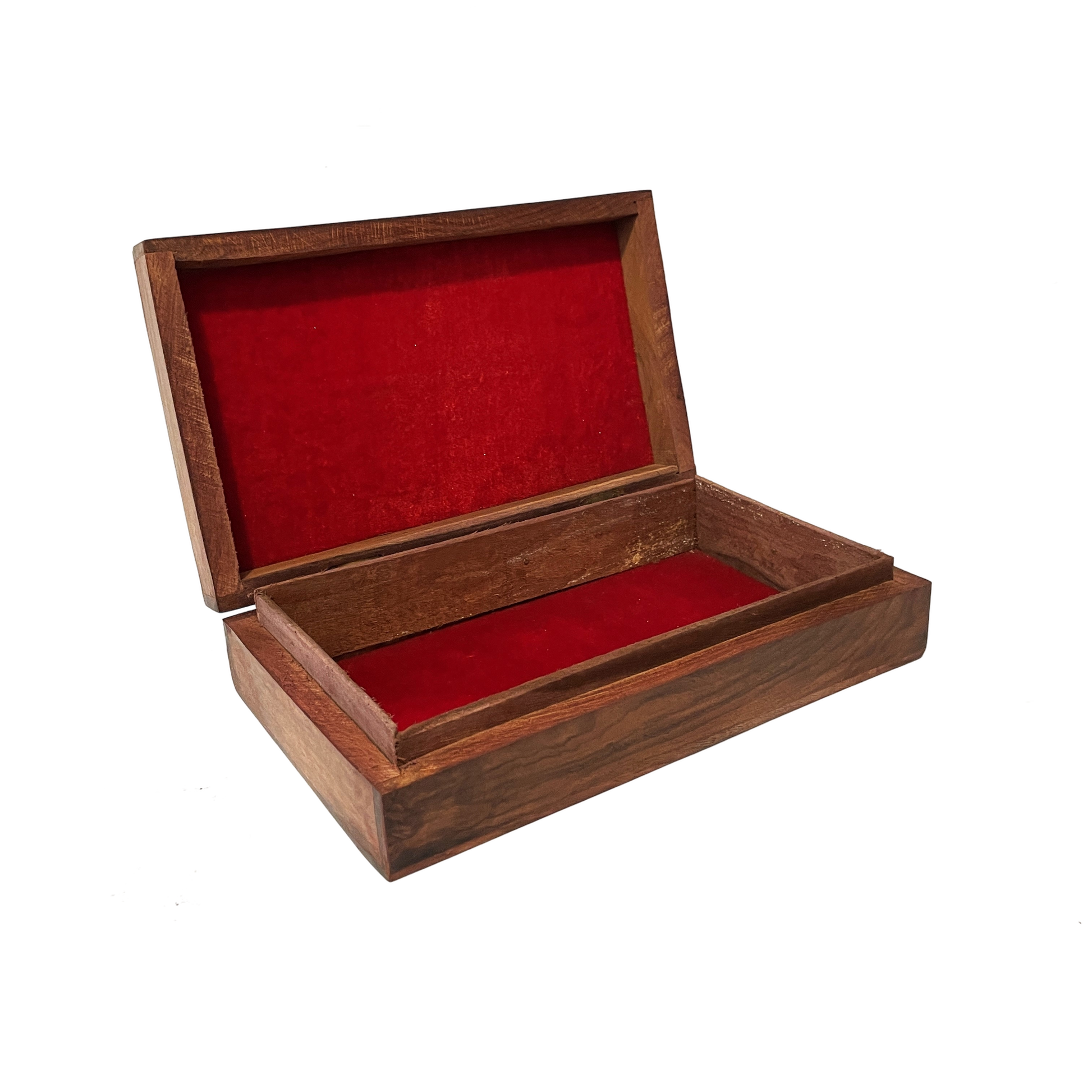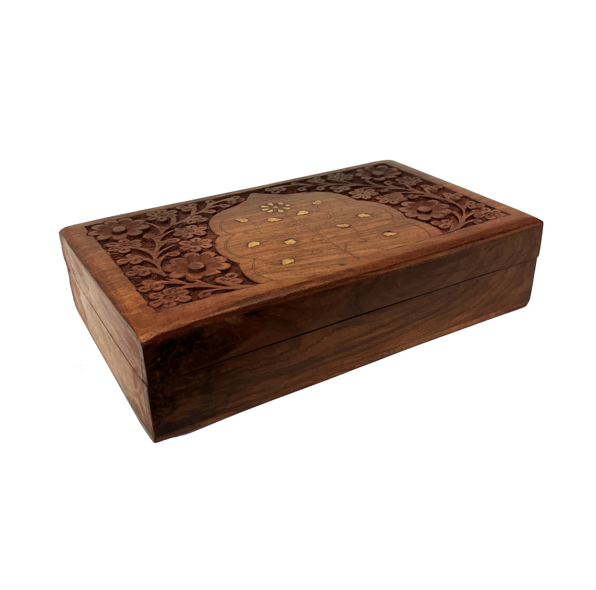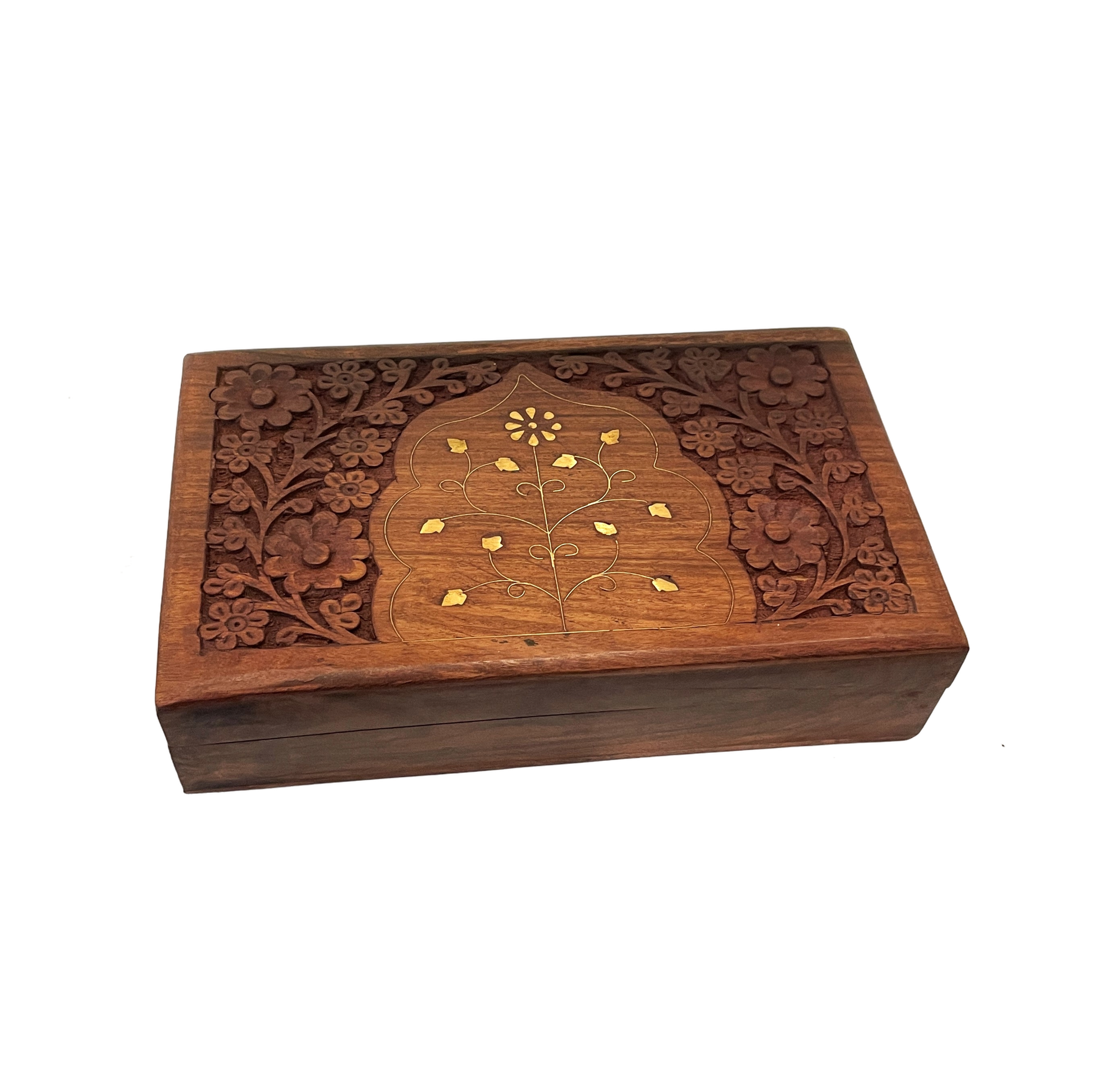 Smuk kiste i træ, udskåret med blomster og messing tråde indlagt