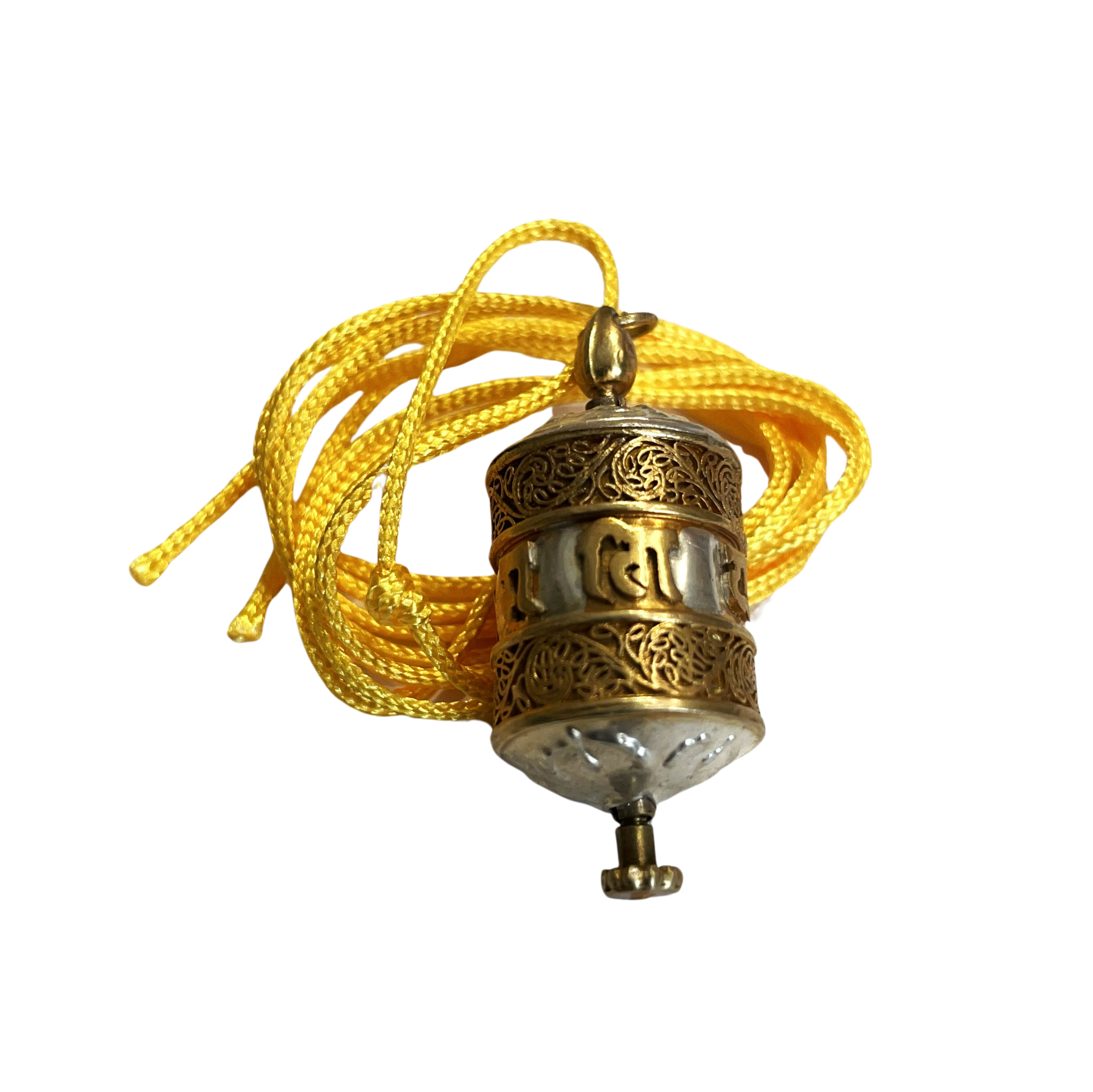 Sterling sølv med forgyldt "Om Mani Padme Hum". Disse små bedemøller indeholder 1,832544 til 2,2 million Mantra'er. Matra'erne er skrevet af Hans Hellighed Dalai Lama. Dimensioner: Højde: 3,5 cm. | Diameter 1,7 cm. | Vægt: 10 gram