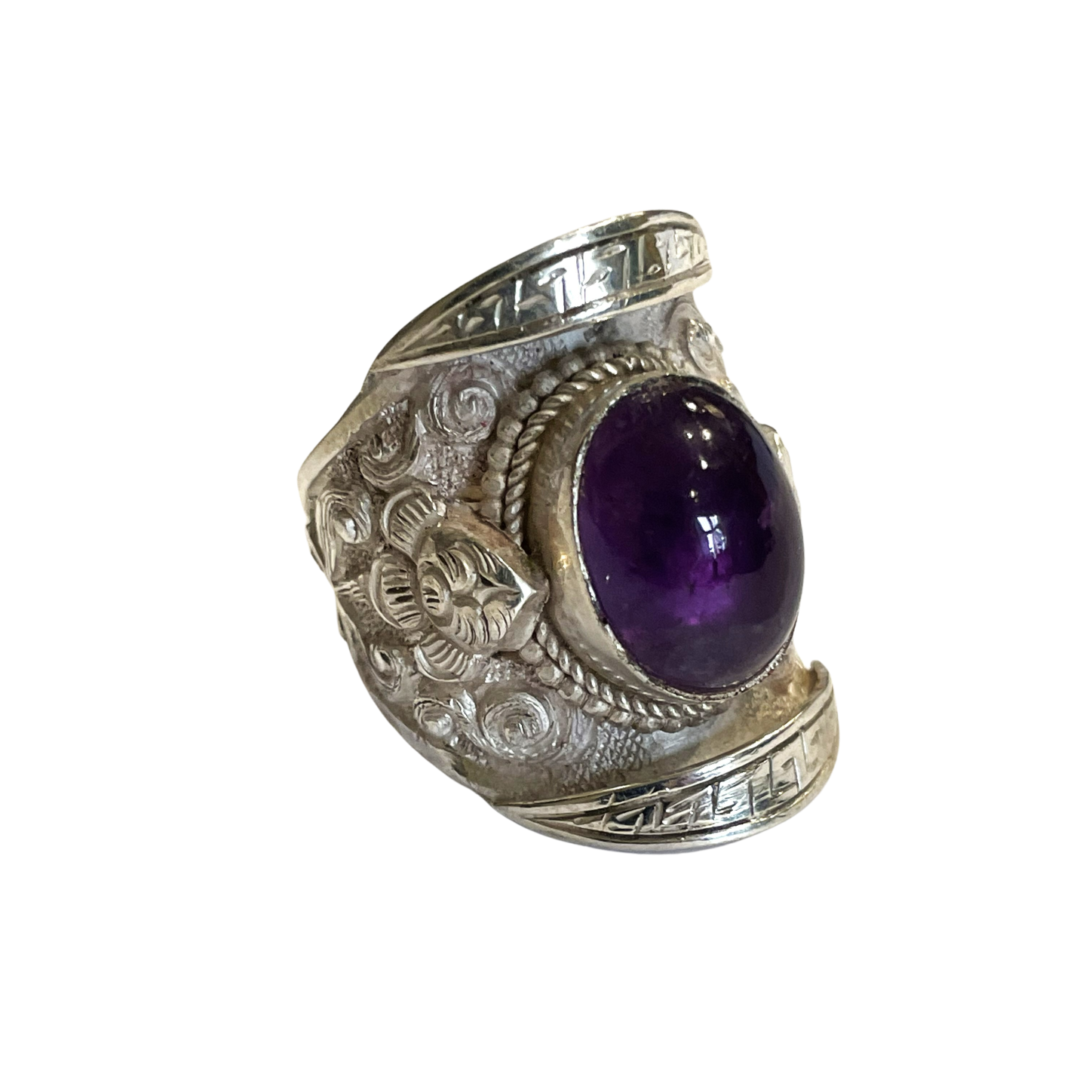 Tibetansk sadel ring i 98% rent sølv og 2% kobber med ametyst. Fremstillet af en tibetansk sølvsmed i Nepal efter et gammelt forbillede.